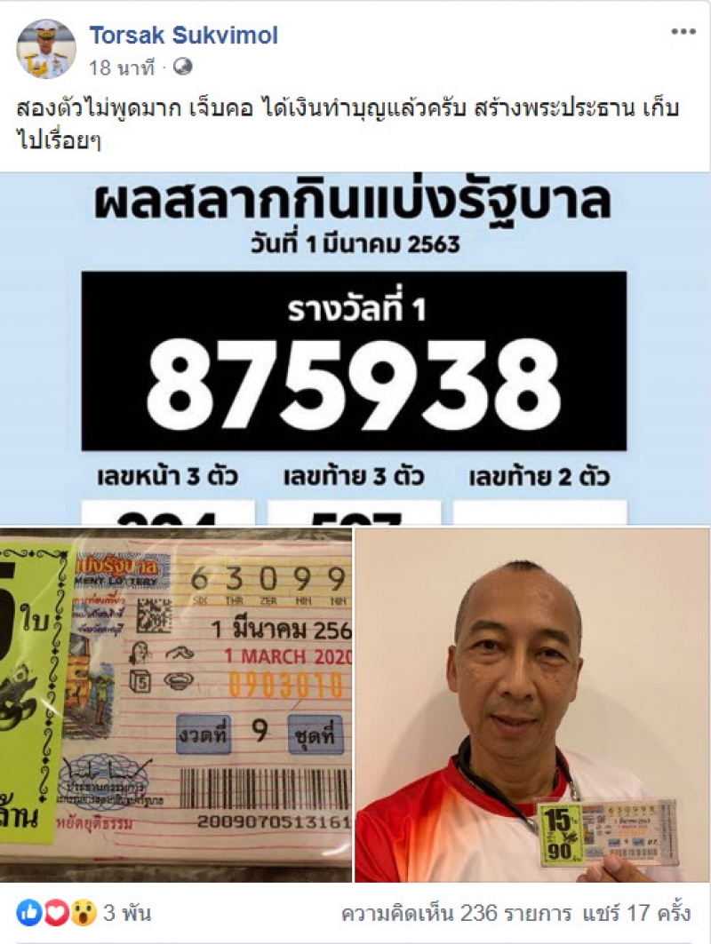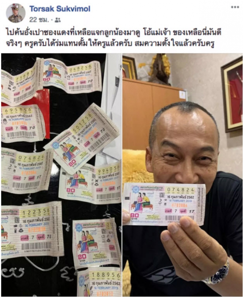 ล่าสุด พล.ต.ต.ต่อศักดิ์ สุขวิมล รองผู้บัญชาการตำรวจสอบสวนกลาง อดีตผู้บังคับการตำรวจมหาดเล็กราชวัลลภ รักษาพระองค์ 904 ได้โพสต์ภาพ พร้อมระบุข้อความว่า สองตัวไม่พูดมาก เจ็บคอ ได้เงินทำบุญแล้วครับ สร้างพระประธานเก็บไปเรื่อยๆ ซึ่งลอตเตอรี่ของ พล.ต.ต.ต่อศักดิ์ นั้นถูกรางวัลเลขท้าย 2 ตัว 98 ถึง 15 ใบ